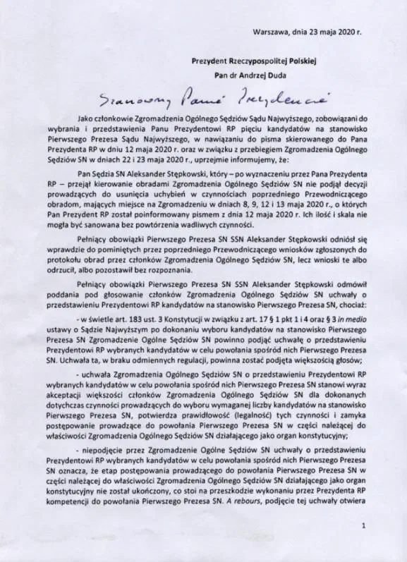 Pismo członków Zgromadzenia Sędziów Sądu Najwyższego do Prezydenta RP:
