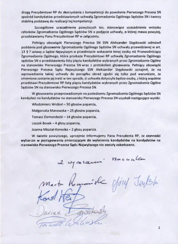 Wniosek o poddanie pod głosowanie przez Zgromadzenie Ogólne Sędziów Sądu Najwyższego uchwały o przedstawieniu Prezydentowi RP pięciu kandydatów Zgromadzenia Ogólnego Sędziów Sądu Najwyższego na stanowisko Pierwszego Prezesa Sądu Najwyższego: