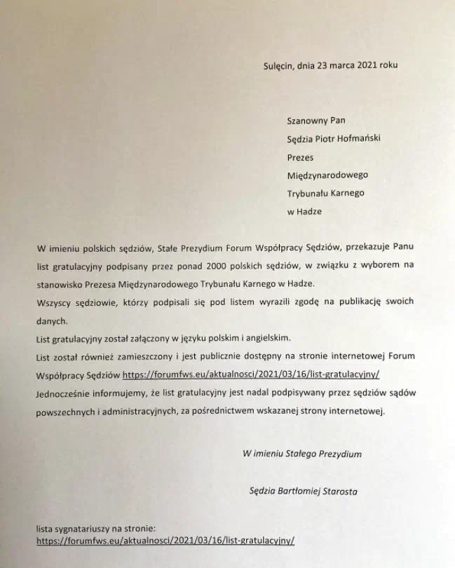- W dniu 11 marca 2021 r. Prof. dr hab. Piotr Hofmański został wybrany Prezesem Międzynarodowego Trybunału Karnego w Hadze na lata 2021-2024.
