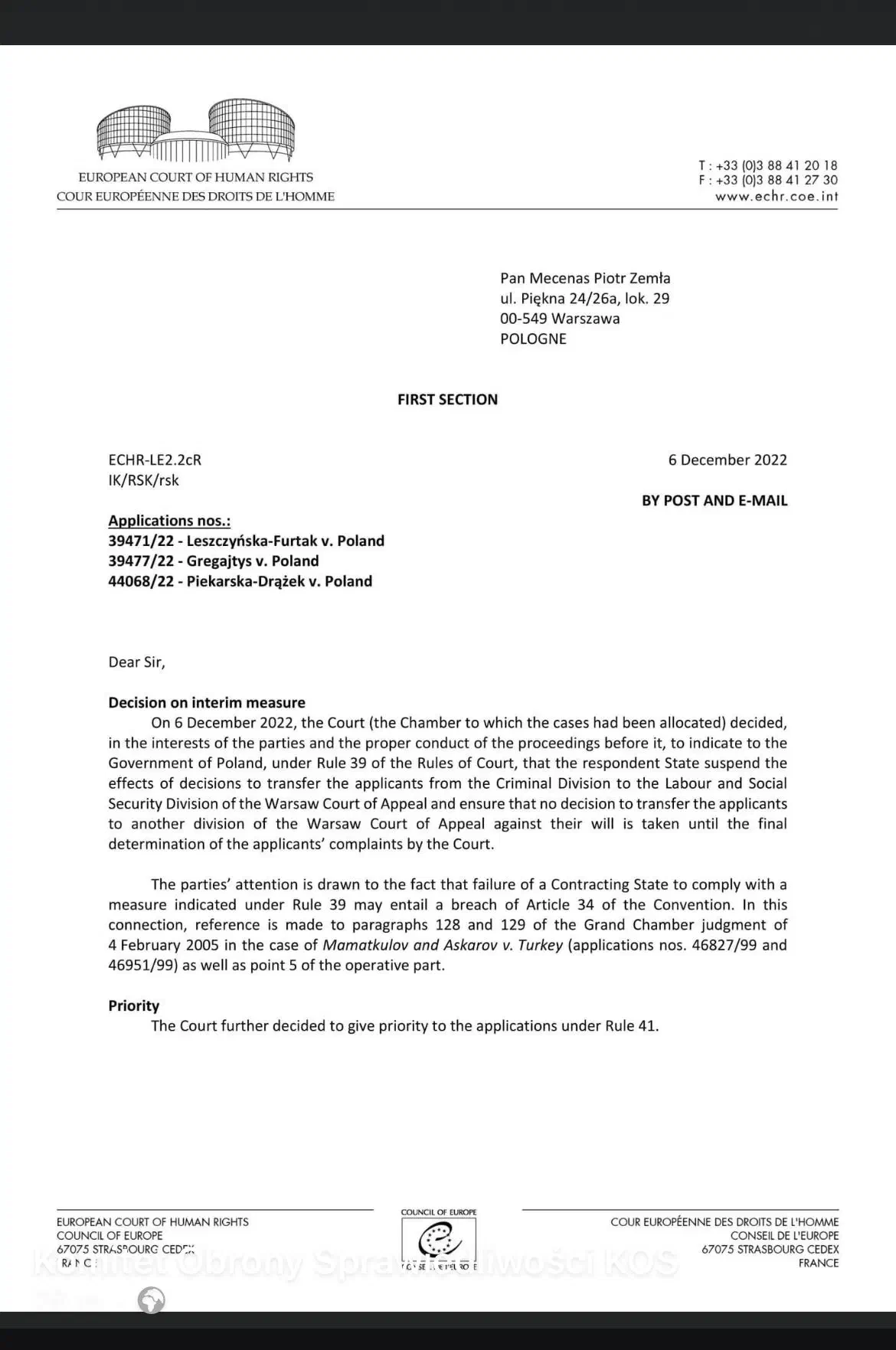 Europejski Trybunał Praw Człowieka orzekł o zabezpieczeniu w sprawie ze skargi trzech sędziów Sądu Apelacyjnego w Warszawie w związku z Ich przeniesieniem z Wydziału Karnego do Wydziału Pracy i Ubezpieczeń Społecznych tego Sądu: