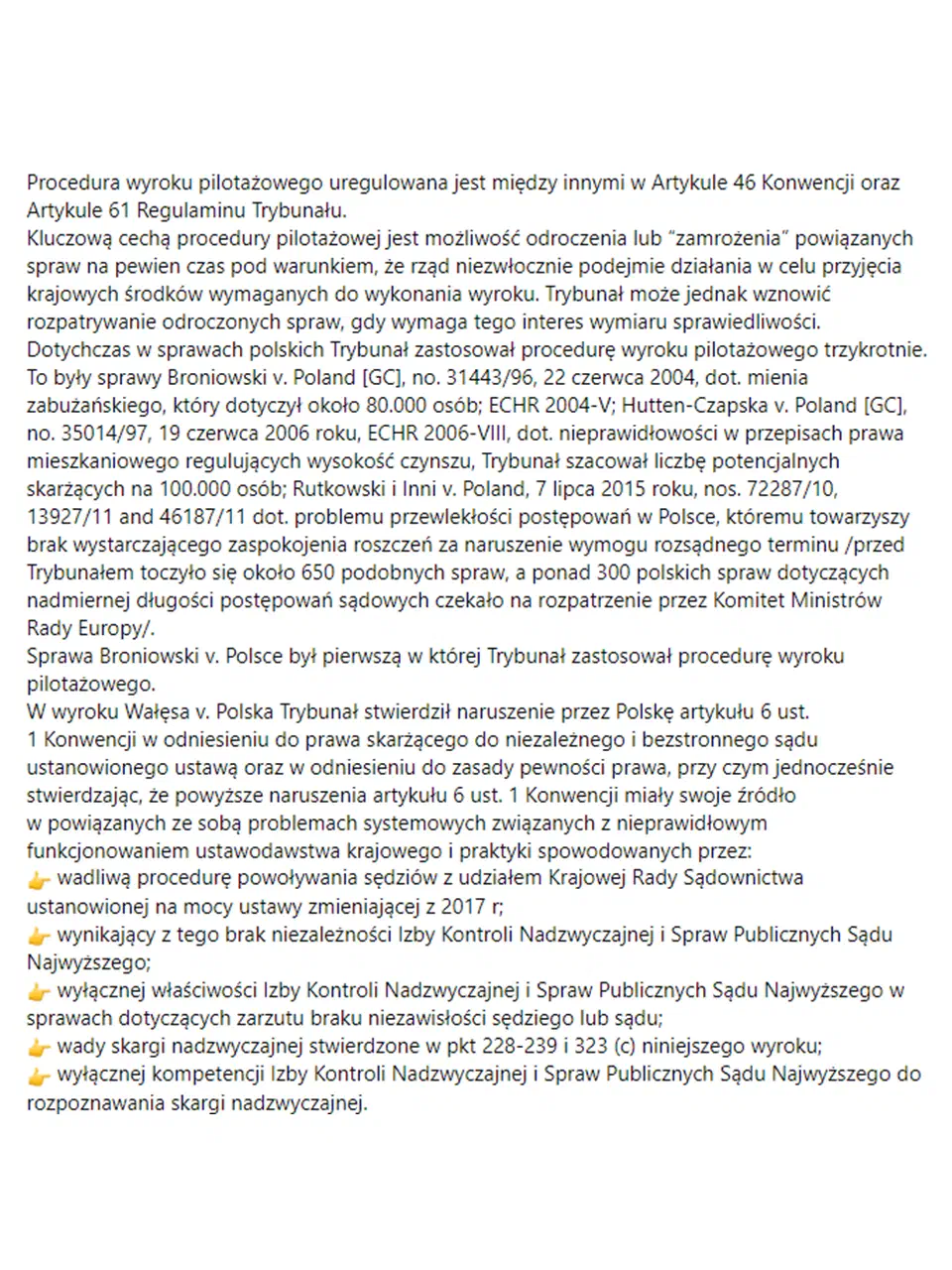 “1) Trybunał może wszcząć procedurę wyroku pilotażowego i przyjąć wyrok pilotażowy, jeżeli okoliczności faktyczne wniosku ujawniają istnienie w danej Umawiającej się Stronie problemu strukturalnego lub systemowego lub innej podobnej dysfunkcji, która spowodowała lub może spowodować podobne wnioski.