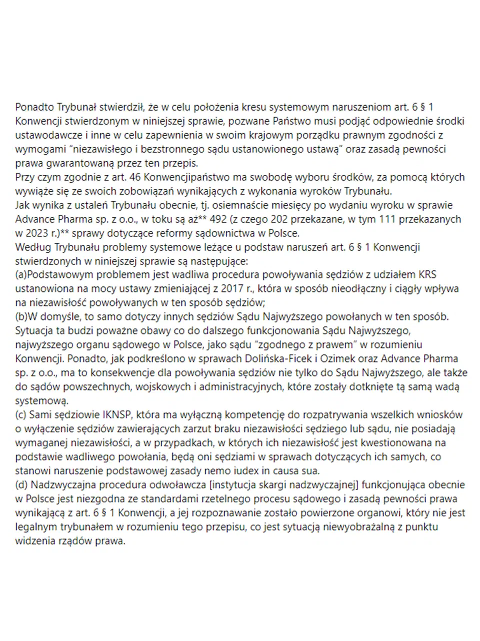 (b)W domyśle, to samo dotyczy innych sędziów Sądu Najwyższego powołanych w ten sposób. Sytuacja ta budzi poważne obawy co do dalszego funkcjonowania Sądu Najwyższego, najwyższego organu sądowego w Polsce, jako sądu “zgodnego z prawem” w rozumieniu Konwencji. Ponadto, jak podkreślono w sprawach Dolińska-Ficek i Ozimek oraz Advance Pharma sp. z o.o., ma to konsekwencje dla powoływania sędziów nie tylko do Sądu Najwyższego, ale także do sądów powszechnych, wojskowych i administracyjnych, które zostały dotknięte tą samą wadą systemową.