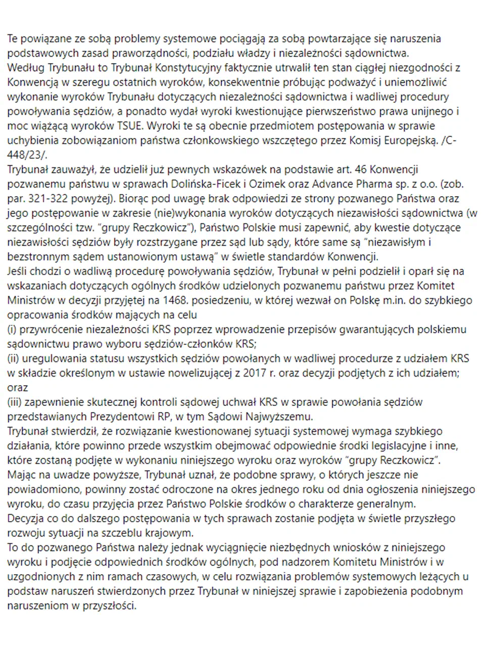 Według Trybunału to Trybunał Konstytucyjny faktycznie utrwalił ten stan ciągłej niezgodności z Konwencją w szeregu ostatnich wyroków, konsekwentnie próbując podważyć i uniemożliwić wykonanie wyroków Trybunału dotyczących niezależności sądownictwa i wadliwej procedury powoływania sędziów, a ponadto wydał wyroki kwestionujące pierwszeństwo prawa unijnego i moc wiążącą wyroków TSUE. Wyroki te są obecnie przedmiotem postępowania w sprawie uchybienia zobowiązaniom państwa członkowskiego wszczętego przez Komisj Europejską. /C- 448/23/.