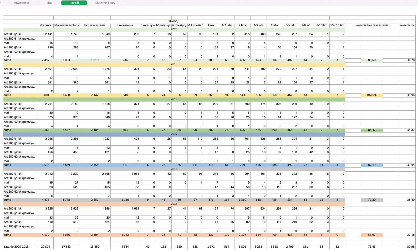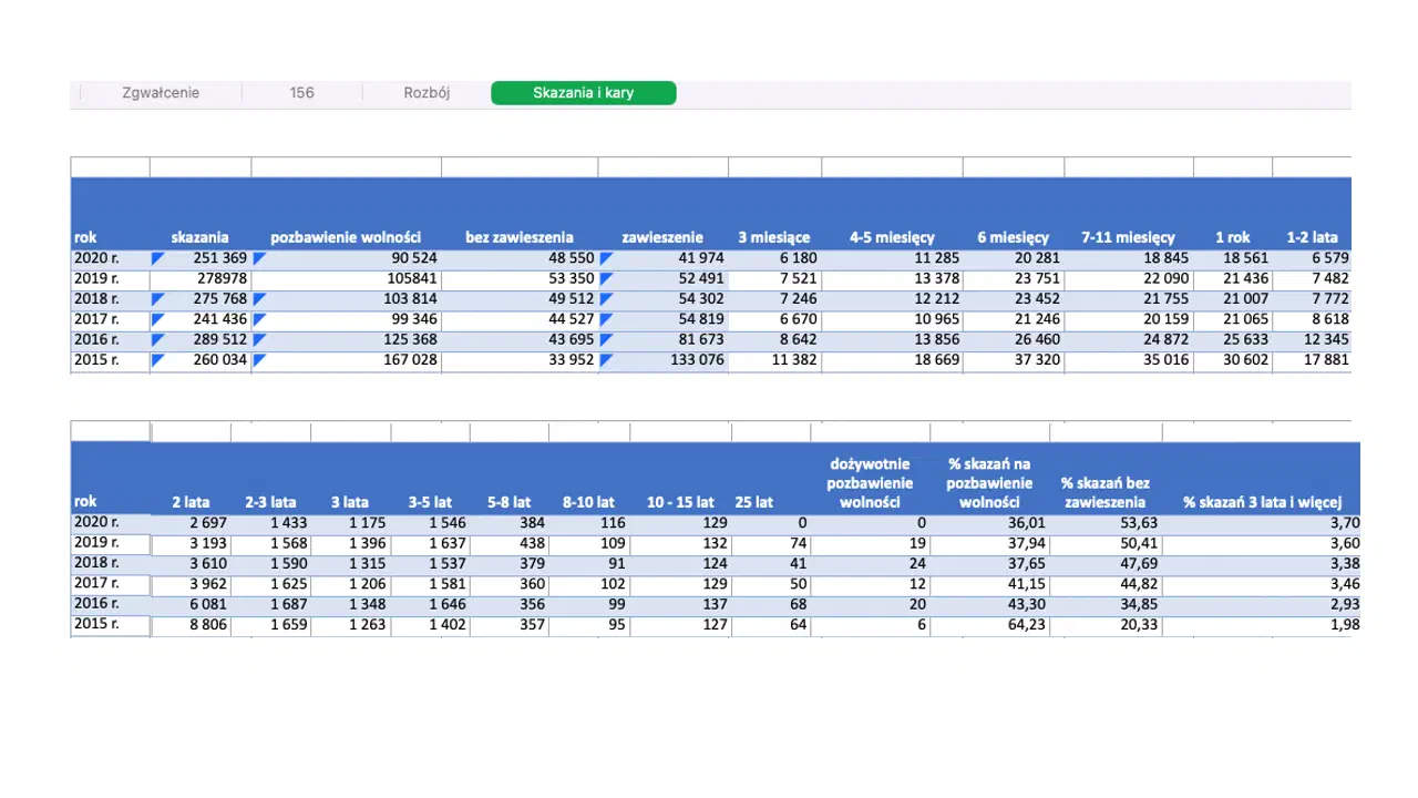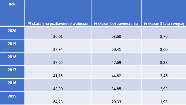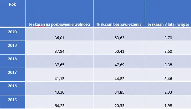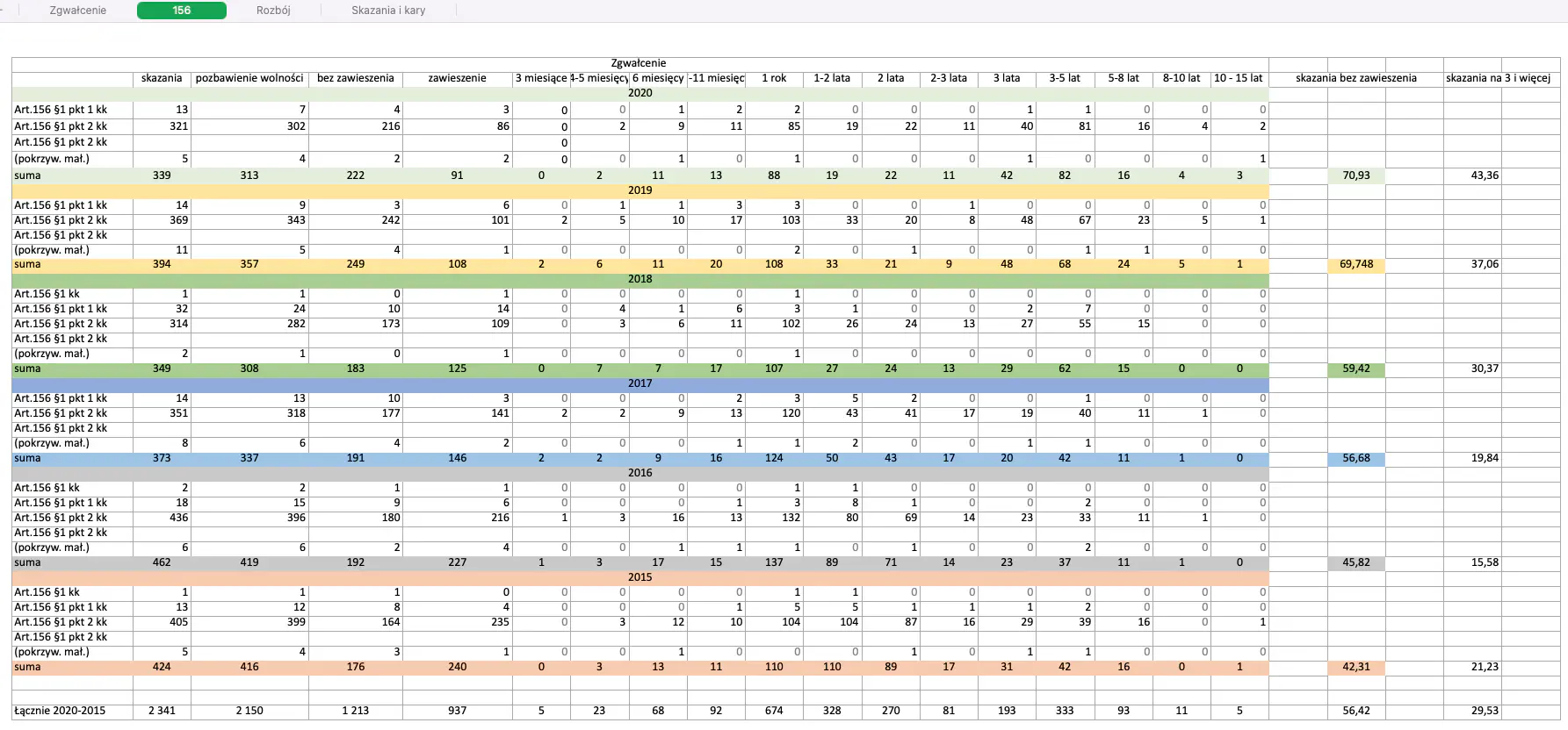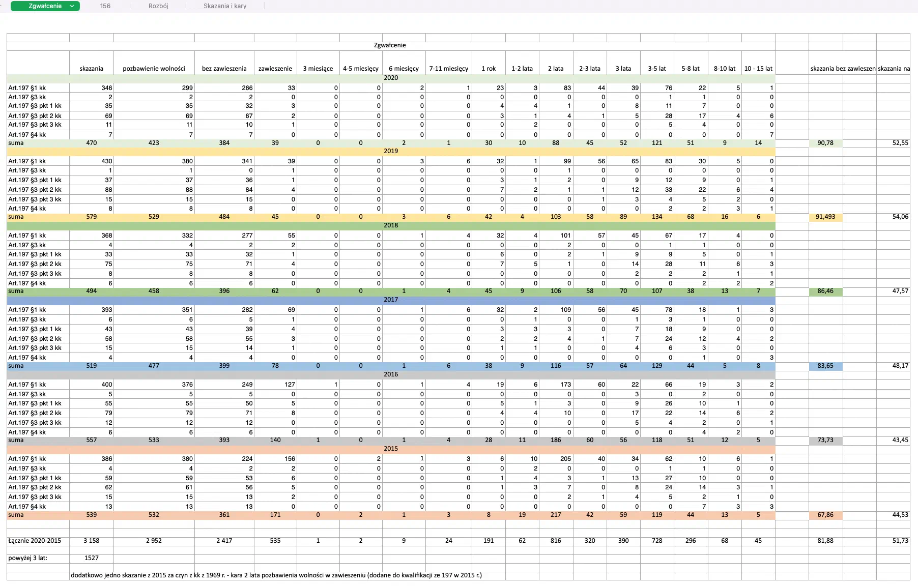 Zgwałcenia – art. 197 § 1, 3 i 4 k.k.: • w sprawach o zgwałcenie w latach 2015-2020 karę pozbawienia wolności bez warunkowego zawieszenia jej wykonania orzeczono w 81,88% spraw. Przy czym należy podkreślić, że kary z warunkowym zawieszeniem wykonania orzekano przede wszystkim w 2015 i 2016 r. (odpowiednio w 32,14% i 26,27). 1 lipca 2015 r. zmieniono przepisy kodeksu karnego i ograniczono możliwość zawieszenia wykonania kary - od tego momentu możliwe jest zawieszenie kary pozbawienia wolności nieprzekraczającej roku. Wcześniej zaś (tj. do 30.06.2015 r.), możliwe było warunkowe zawieszenie wykonania kary pozbawienia wolności nieprzekraczającej 2 lat, a zgodnie z ogólnymi zasadami prawa karnego, co do zasady stosuje się ustawę nową, chyba że poprzednio obowiązująca jest względniejsza dla sprawcy. Jeśli czyn popełniono przed 30.06.2015 r. ustawą “względniejszą dla sprawcy” były przepisy kodeksu karnego sprzed 1 lipca 2015 r. Lata 2015 i 2016 to lata graniczne – „kończone” były sprawy, w których przestępstwo popełniono na „starych” przepisach. • od 2017 r. zmniejsza się liczba kar z warunkowym zawieszeniem jej wykonania, a w latach 2019-2020 kara pozbawienia wolności z warunkowym zawieszeniem jej wykonania została orzeczona w mniej niż 10% spraw o czyny z art. 197 par. 1, 3 i 4; • najczęściej orzekane są kary w granicach 3-5 lat pozbawienia wolności, czyli w granicach dolnego ustawowego zagrożenia karą (najniższa możliwa kara to 2 lata pozbawienia wolności); • od 2017 r. zwiększa się surowość kar orzekanych za przestępstwo zgwałcenia, ale największe zmiany widać w danych statystycznych z lat 2019 i 2020 r. Wobec ponad połowy osób skazanych za zgwałcenie orzeczono karę 3 lat pozbawienia wolności i surowszą (odpowiednio: w 2019 r. w 54,06%, w 2020 - 52,55%); • należy wziąć pod uwagę liczbę postępowań karnych o zgwałcenie - w latach 2015-2020 r. było łącznie takich postępowań (zakończonych prawomocnym wyrokiem skazującym) 3 158. Brak jest danych dotyczących uniewinnień za poszczególne przestępstwa w kolejnych okresach statystycznych. Rozboje: • w latach 2015-2020 prawomocnie zakończono 20.804 sprawy o rozbój, czyli ponad 6,5 razy więcej niż o zgwałcenie. Trudno zatem porównywać te dwa rodzaje przestępstw i praktykę sądów, rodzaje wymierzanych kar – nie tylko ze względu na odmiennych charakter, specyfikę tych czynów zabronionych – ale także ze względu ogólną na liczbę spraw. • podobną tendencję z zawieszeniem wykonania kary w latach 2015-2016 widać także w sprawach o rozbój. W tych latach, w sprawach o rozbój, karę z warunkowych zawieszeniem jej wykonania orzekano odpowiednio w 43,33% sprawy w 2015 r. i 29,8% spraw w 2016 r. Zmiana liczby kar z warunkowym zawieszeniem ich wykonania, tj. znaczący spadek orzekania tych kar, związany jest z nowelizacją przepisów kodeksu karnego. • Surowość kar orzekanych za rozbój jest niższa niż w sprawach o zgwałcenie - najczęściej orzekana jest kara 2 lat pozbawienia wolności (dolna granica) zagrożenia karą, kara 3 lat i więcej pozbawienia wolności to ok. 30-35% spraw. Brak jest danych, czy kara 3 i więcej lat pozbawienia wolności dotyczy występku o charakterze chuligańskim, czy sąd orzekł karę powyżej dolnej granicy ustawowego zagrożenia. Ciężkie uszkodzenie ciała – art. 156 § 1 k.k. • Analiza danych statystycznych jest trudniejsza z uwagi na zmiany w wysokości sankcji – podniesienie dolnej granicy ustawowego zagrożenia – w 2017 r. W kolejnych latach, jeśli czyn był popełniony przed 13 lipca 2017 r. (przed wejściem w życie ustawy z dnia 23 marca 2017 r. o zmianie ustawy - Kodeks karny, ustawy o postępowaniu w sprawach nieletnich oraz ustawy - Kodeks postępowania karnego; Dz.U.2017, poz. 773), do momentu prawomocnego zakończenia postępowania stosuje się przepisy „względniejsze dla sprawcy” - zgodnie z art. 4 § 1 k.k. „jeżeli w czasie orzekania obowiązuje ustawa inna niż w czasie popełnienia przestępstwa, stosuje się ustawę nową, jednakże należy stosować ustawę obowiązującą poprzednio, jeżeli jest względniejsza dla sprawcy”. • Z tego powodu w statystykach dostępnych na stronach Instytutu Wymiaru Sprawiedliwości (dane obejmują okres do 2020 r.) nie widać jeszcze w pełni zaostrzenia przepisów prawa karnego materialnego. • Warto jednak zauważyć, że o ile w 2016 r. i 2017 r. kary z warunkowym zawieszeniem ich wykonania (czyli do 1 roku pozbawienia wolności oraz – ewentualnie – „pozostałości” kar orzekanych na podstawie przepisów obowiązujących do 30.06.2015 r.) stanowiły odpowiednio 54,18% w 2016 r. i 43,32% w 2017 r., o tyle w 2019 i 2020 r. było to 29,07% kar w 2020 r. i 30,25%. W 2020 r. 43,36% wobec osób skazanych za czyn z art. 156 § 1 k.k. orzeczono karę 3 i więcej lat pozbawienia wolności. • Przestępstw z art. 156 § 1 k.k. było w latach 2015-2020 łącznie 2341.