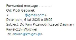 P.S. List traktuję jako otwarty, bo dotyczy Pani działalności publicznej i urzędowej Proszę pamiętać, że nazywam się Piotr Gąciarek, nie Piotr G, niezależnie jaki obieg mego listu Pani zarządzi. Z góry dziękuję.