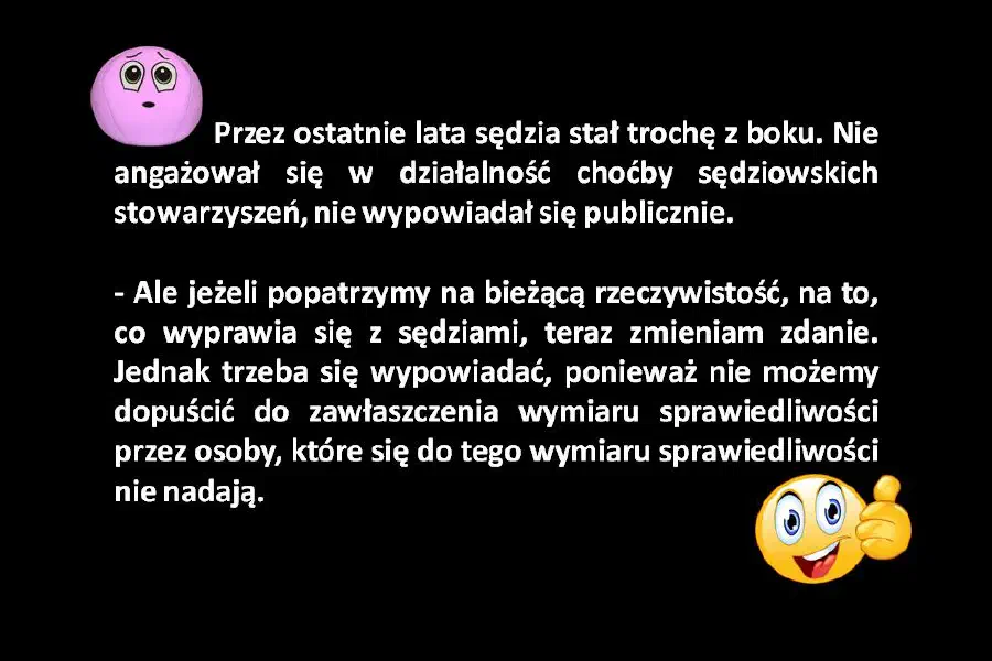 Absolutnie jednak nie chcę, by moja wypowiedź była odebrana jako atak na Pana sędziego, cichego bohatera artykułu. Cieszę się, że postanowił nie stać już z boku i liczę na to, że będzie to wspaniały początek współpracy dla dobra praworządnej Polski. Nikomu z tych sędziów, którzy stali lub jeszcze stoją z boku, nie odmówiłem konsultacji, pomocy i szacunku dla przełamania się.