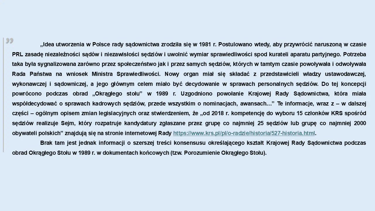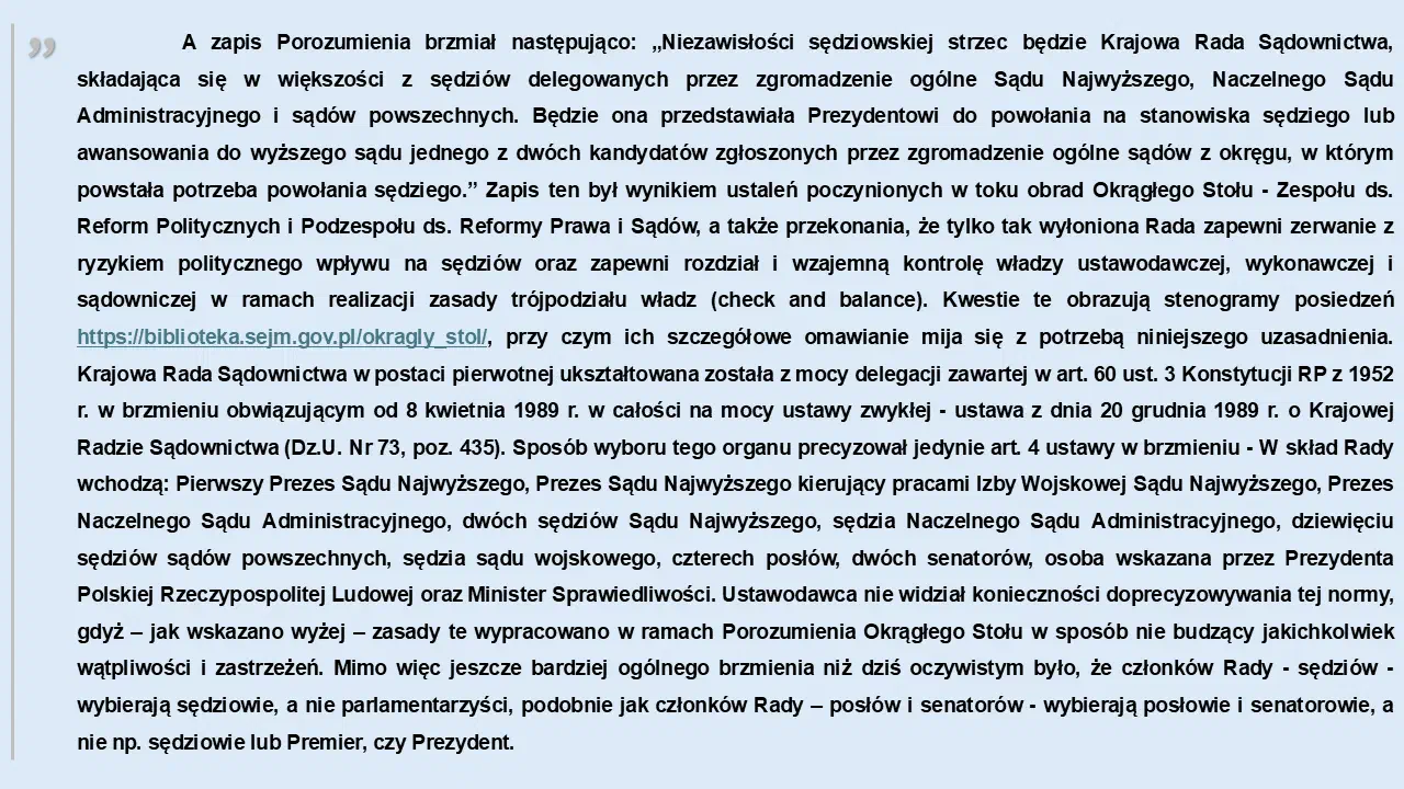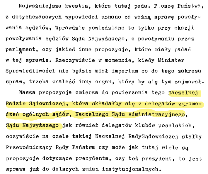 Rozumieli to natomiast doskonale ci, którzy w 1989 r. tworzyli zręby niepodległej, demokratycznej Polski. Rozumieli oni, że większym zagrożeniem dla demokratycznego państwa prawa jest ryzyko jakiegokolwiek wpływu partii na wybór sędziów, niż nawet samo istnienie Rady Państwa w procesie powoływania sędziów, która to instytucja – jak sygnalizuje inny mój znajomy aspirujący do stanowiska sędziego – była „elementem obcej władzy przywiezionej na ruskich czołgach”.