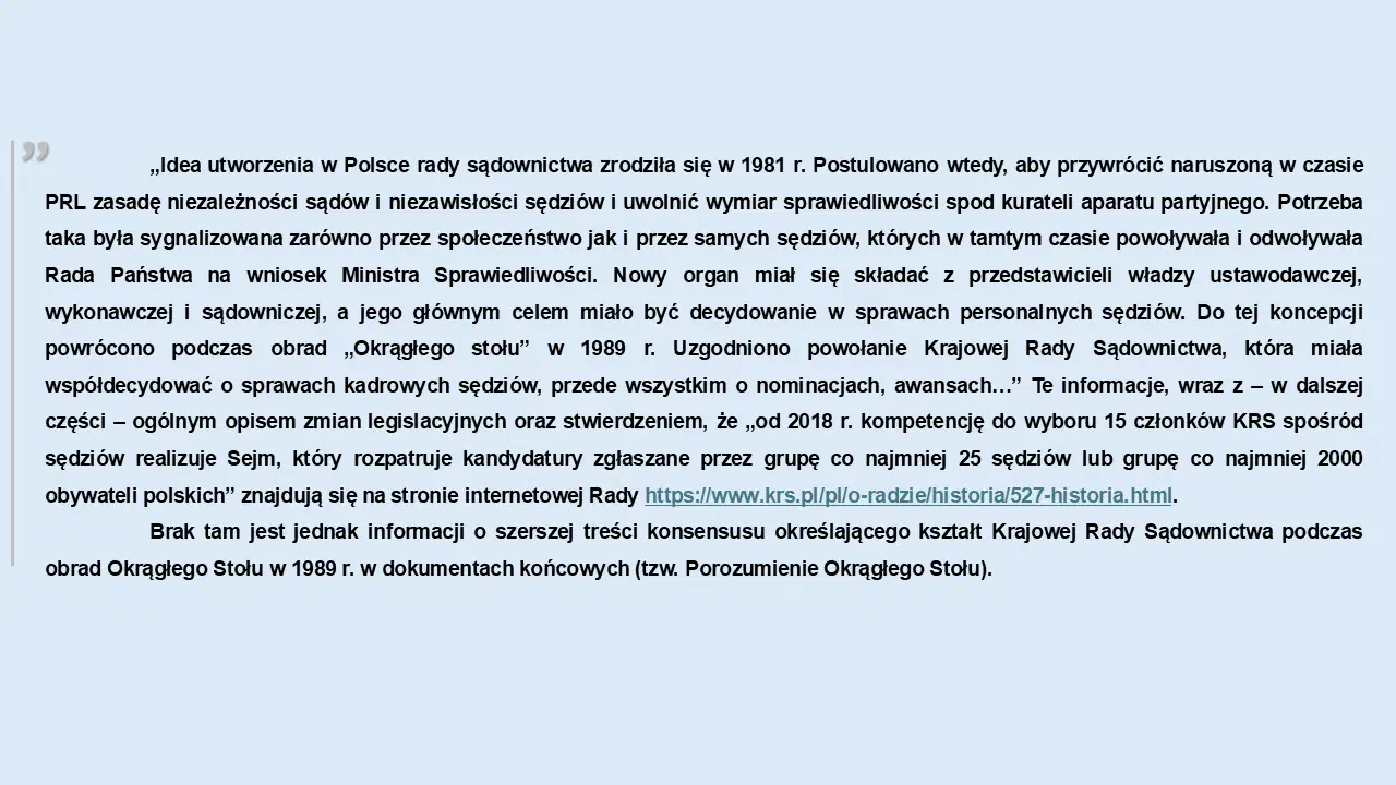 Aby więc odtworzyć ten tok myślenia, wypada sięgnąć do materiałów źródłowych i poznać przesłanki, jakimi kierowali się przedstawiciele demokratycznej opozycji w PRL, postulując utworzenie Krajowej Rady Sądownictwa (w pierwotnych rozmowach określanej mianem „Naczelnej Rady Sądownictwa”), a następnie twórcy Konstytucji z 1997 r.