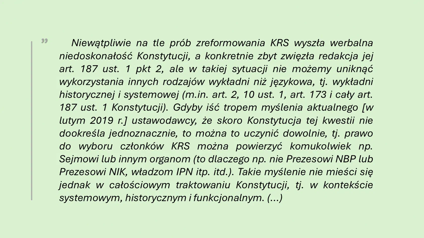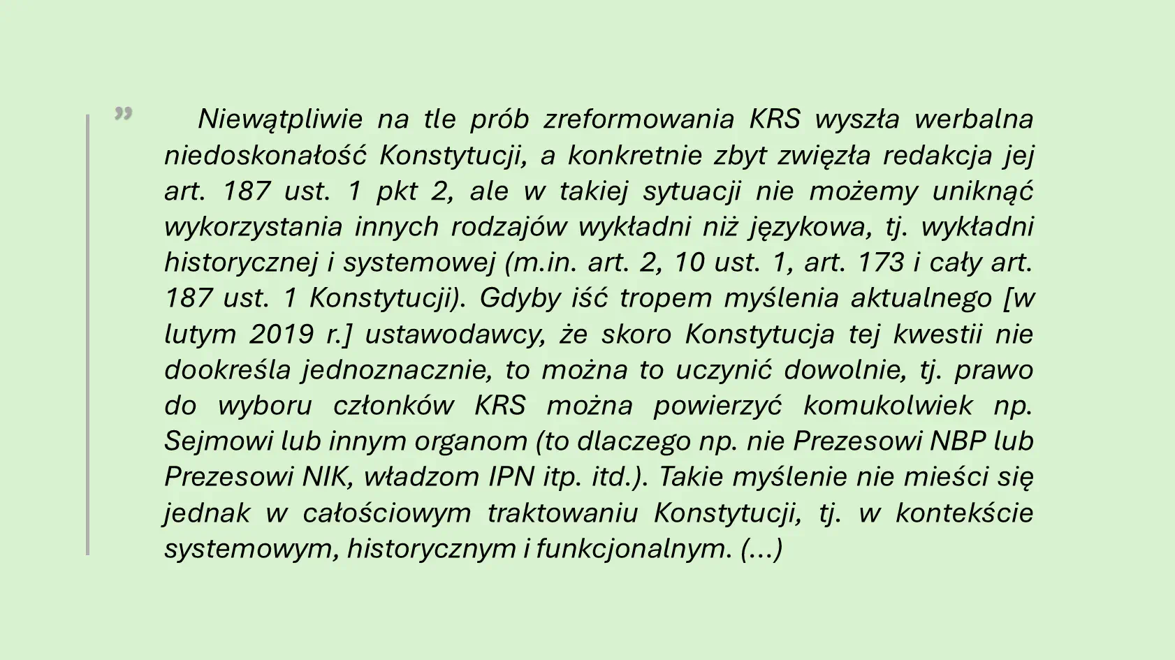 Oczywiście stanowisko to wychodzi z założenia, że przepis art. 187 ust. 1 pkt 2 Konstytucji RP daje wyłącznie sędziom prawo do wyłonienia 15-stu sędziowskich członków pełnego 25-osobowego składu Rady. Podobnie jak pkt 3 przyznaje Sejmowi i Senatowi tylko prawo wyboru odpowiednio 4 posłów i 2 senatorów. Faktycznie redakcja przepisu art. 187 ust. 1 pkt 2 jest „zbyt zwięzła”, jak ongiś słusznie wskazywał cytowany przeze mnie znajomy. Jednak normę prawną każdy prawnik buduje w kontekście systemowym, celowościowym, historycznym… Nie chodzi tu bynajmniej o ryzyko przyjęcia jakiejś karkołomnej interpretacji stwarzającej ryzyko powierzenia wyboru członków KRS Prezesowi NBP lub Prezesowi NIK. Chodzi o znacznie poważniejsze ryzyko. O ryzyko dokonania wyboru przeważającej części Krajowej Rady Sądownictwa przez aktualną polityczną większość parlamentarną, która postanowi tak wymodelować wymiar sprawiedliwości, by sędziami uczynić osoby sobie spolegliwe, służalczo wykonujące rozkazy partii sprawującej władzę parlamentarną. Nie chodzi mi o jakiś aktualny, czy miniony kontekst polityczny, ale gdy sędzią zostaje osoba wpłacająca na fundusz wyborczy jakiejkolwiek partii znaczną kwotę w okresie bezpośrednio poprzedzającym uzyskanie nominacji sędziowskiej, gdy sędzią zostaje były zasłużony członek partii sprawującej władzę parlamentarną, który składa legitymację partyjną tuż przed skutecznym zgłoszeniem akcesu na sędziego, to istnieje wysokie ryzyko, że sąd ustanowiony z udziałem takiej osoby nie będzie spełniał wymogów niezawisłości i bezstronności. Krótko mówiąc, że potencjalnie będzie służył nie obywatelom, lecz interesowi partii, która pośrednio uczyniła go sędzią. A sąd musi być wolny od takiego ryzyka. Niezależnie od tego, kto rządzi. Bo każda władza niesie ze sobą pokusę.