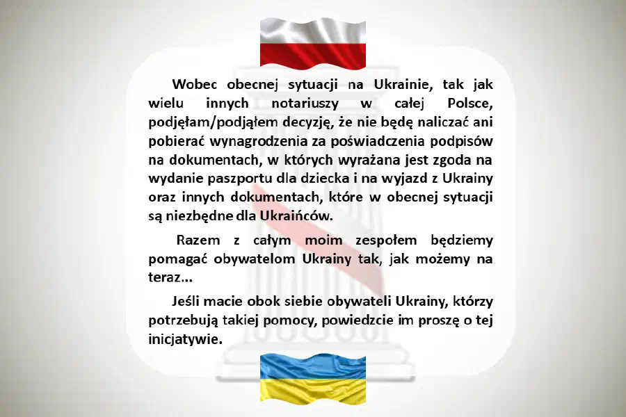 Wobec obecnej sytuacji na Ukrainie, tak jak wielu innych notariuszy w całej Polsce, podjęłam/podjąłem decyzję, że nie będę naliczać ani pobierać wynagrodzenia za poświadczenia podpisów na dokumentach, w których wyrażana jest zgoda na wydanie paszportu dla dziecka i na wyjazd z Ukrainy oraz innych dokumentach, które w obecnej sytuacji są niezbędne dla Ukraińców.