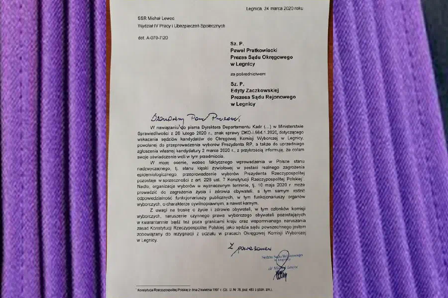 Pismo sędziego Michała Lewoca w sprawie zgłoszenia do Okręgowej Komisji Wyborczej