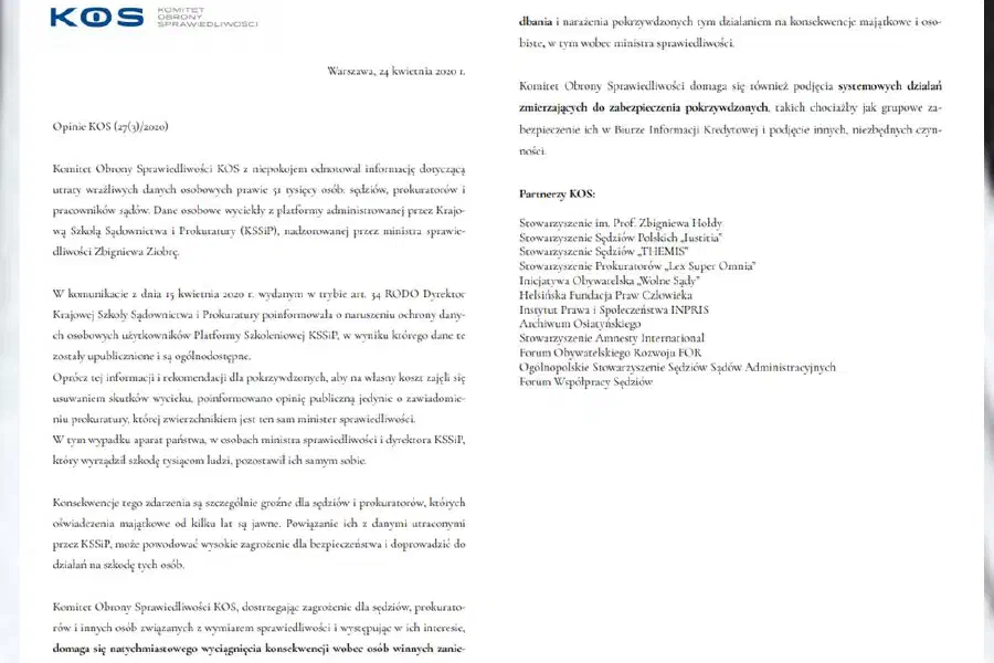 Stałe Prezydium Forum Współpracy Sędziów przyłączyło się jako sygnatariusz, do stanowiska Komitetu Obrony Sprawiedliwości (KOS) w sprawie wycieku danych z Krajowej Szkoły Sądownictwa i Prokuratury.