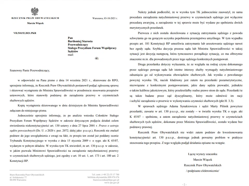 W związku z bezprecedensową decyzją Ministra Sprawiedliwości o odsunięciu sędziego Adama Synakiewicza od czynności orzeczniczych sędziowie - członkowie Stałego Prezydium Współpracy Sędziów postanowili skierować wystąpienie do Rzecznika Praw Obywatelskich. Pełną treść publikujemy poniżej oraz - do pobrania - w załączniku.