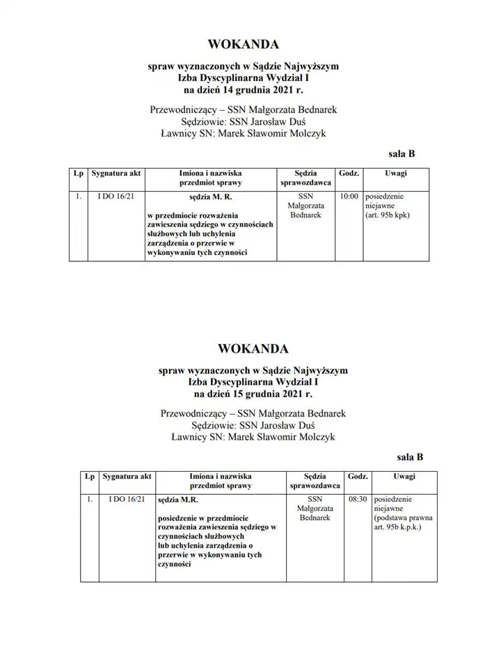 Na dzień 14 grudnia 2021 r. zostało wyznaczone posiedzenie Izby Dyscyplinarnej w przedmiocie rozważenia zawieszenia sędziego w czynnościach służbowych lub uchylenia zarządzenia o przerwie w wykonywaniu tych czynności.