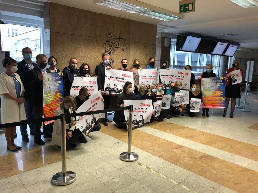 Krakowscy sędziowie stanęli przy wejściu do Sądu Okręgowego z plakatami z wizerunkami jego i innych represjonowanych sędziów.