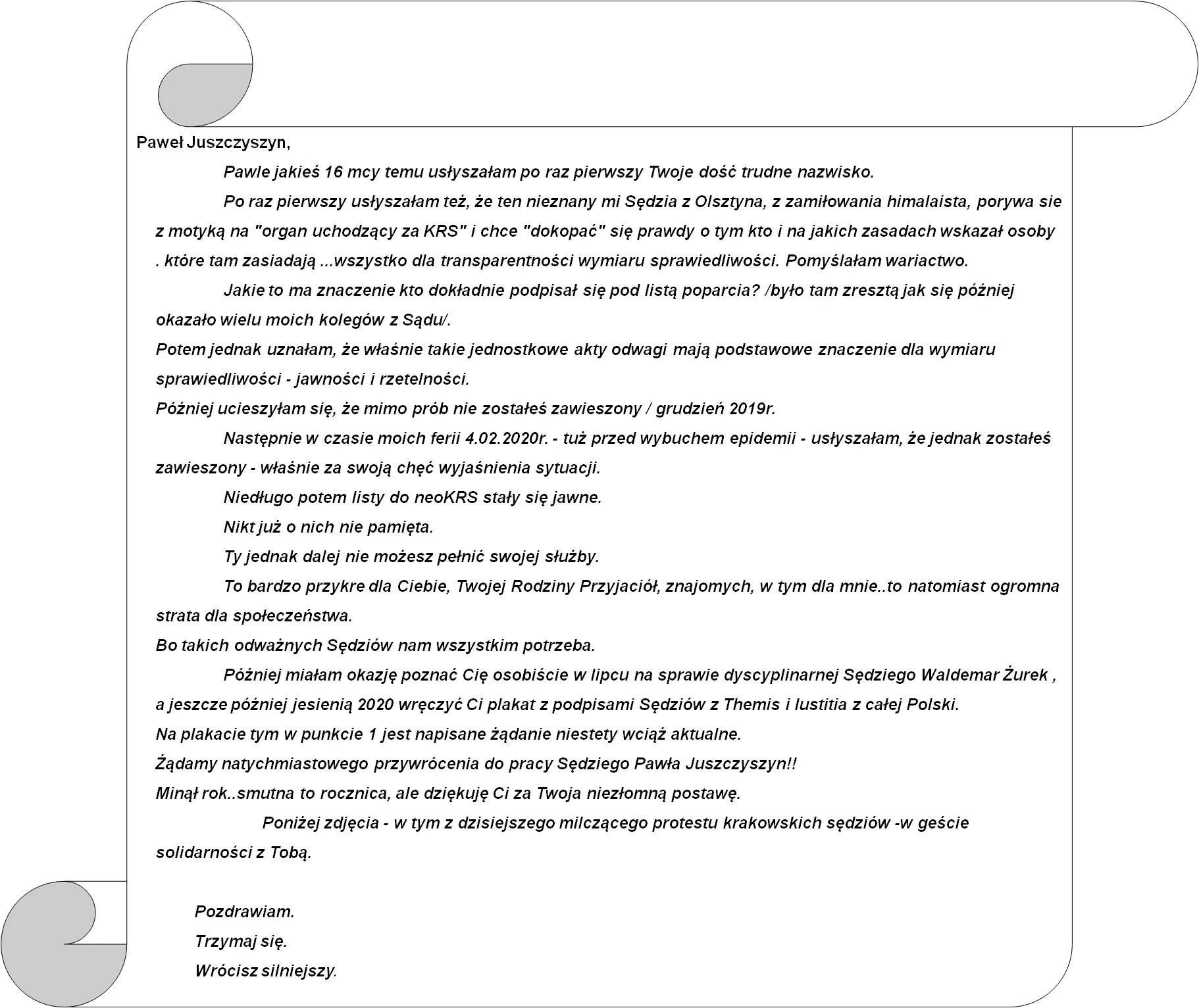W dniu 04 lutego 2021 r. minął dokładnie rok, odkąd sędzia Paweł Juszczyszyn został zawieszony w pełnieniu swych obowiązków za to, że podjął czynności w kierunku wykonania wytycznych wynikających w wyroku Trybunału Sprawiedliwości Unii Europejskiej z dnia 19 listopada 2019 r. i uchwały połączonych trzech Izb Sądu Najwyższego z 23 stycznia 2020 r.
