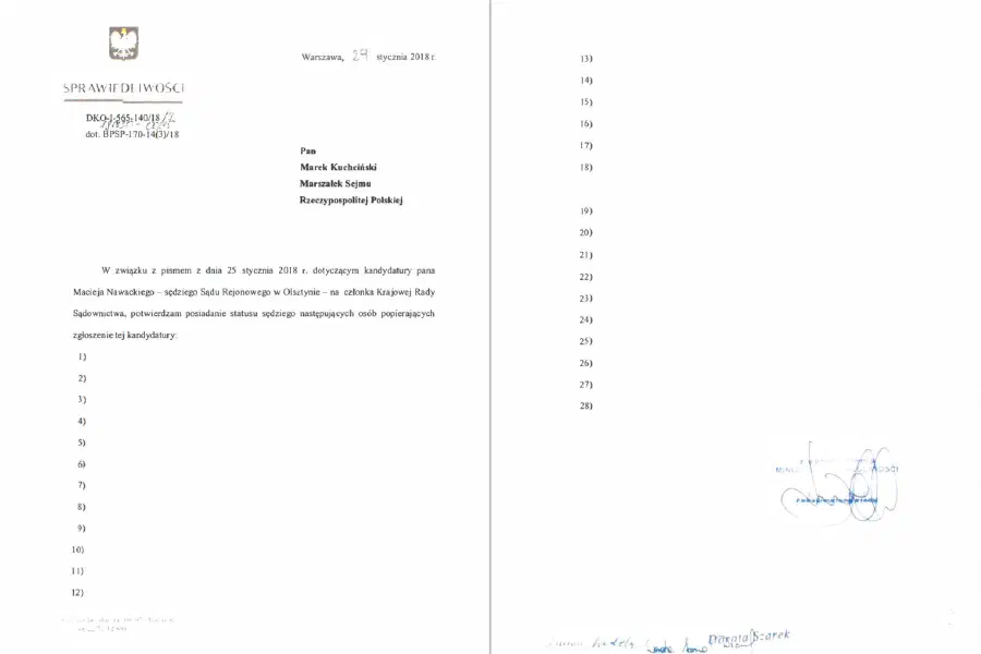 To bardzo ciekawe, zwłaszcza, że sędziowie sami zaczęli się ujawniać. Na stronie „Iustitii” na bieżąco publikowane są oświadczenia w tym przedmiocie, ostatnio w liczbie 21. Pojawiły się domysły, że chodzi o sędziego Nawackiego, który wg wcześniejszych informacji zdobył 28 podpisów, ale 4 zostały wycofane, nie ma więc wymaganych 25. Do tego głosowanie na całą 15 sędziowskich członków KRS było wspólne, więc wadliwość zgłoszenia jednego kandydata skutkuje wadliwością wyboru całej 15. I tu jednak formalnie da się bronić wykładni, co zresztą już było czynione, że złożonego podpisu na liście poparcia, jak głosu wrzuconego do urny, wycofać nie można. Chyba nie o to zatem chodzi.