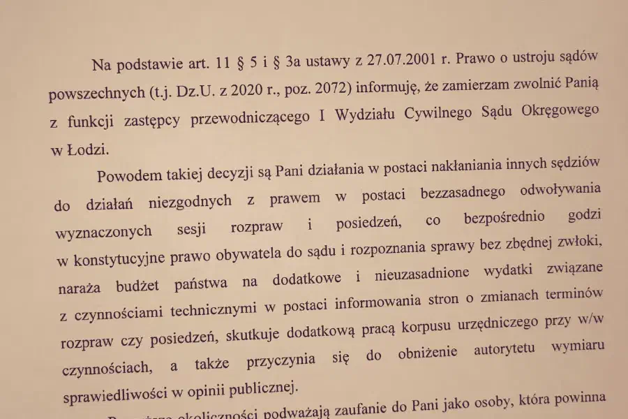 W związku z otrzymanym w dniu 5 stycznia 2021 r. pismem, datowanym 31 grudnia 2020 r., o zamiarze zwolnienia mnie z funkcji zastępcy przewodniczącej I Wydziału Cywilnego Sądu Okręgowego w Łodzi ze względu na moje działania w postaci nakłaniania innych sędziów do działań niezgodnych z prawem w postaci bezzasadnego odwoływania wyznaczonych sesji rozpraw i posiedzeń, co bezpośrednio godzi w konstytucyjne prawo obywatela do sądu i rozpoznania sprawy bez zbędnej zwłoki, naraża budżet państwa na dodatkowe i nieuzasadnione wydatki związane z czynnościami technicznymi w postaci informowania stron o zmianach terminów rozpraw czy posiedzeń, skutkuje dodatkową pracą korpusu urzędniczego przy w/w czynnościach, a także przyczynia się do obniżenia autorytetu wymiaru sprawiedliwości w opinii publicznej.