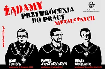 Odsunięcie od orzekania sędziów: Pawła Juszczyszyna, Beaty Morawiec i Igora Tuleyi łamie konstytucję i jest odwetem za ich niezłomność w bronieniu demokracji i trójpodziału władzy.