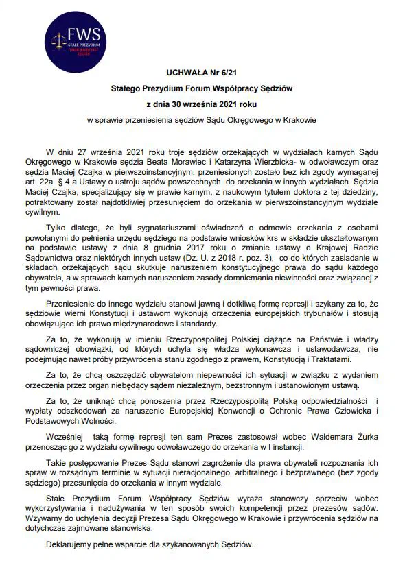 Stałe Prezydium Forum Współpracy Sędziów wyraża stanowczy sprzeciw wobec wykorzystywania i nadużywania w ten sposób swoich kompetencji przez prezesów sądów. Wzywamy do uchylenia decyzji Prezesa Sądu Okręgowego w Krakowie i przywrócenia sędziów na dotychczas zajmowane stanowiska.